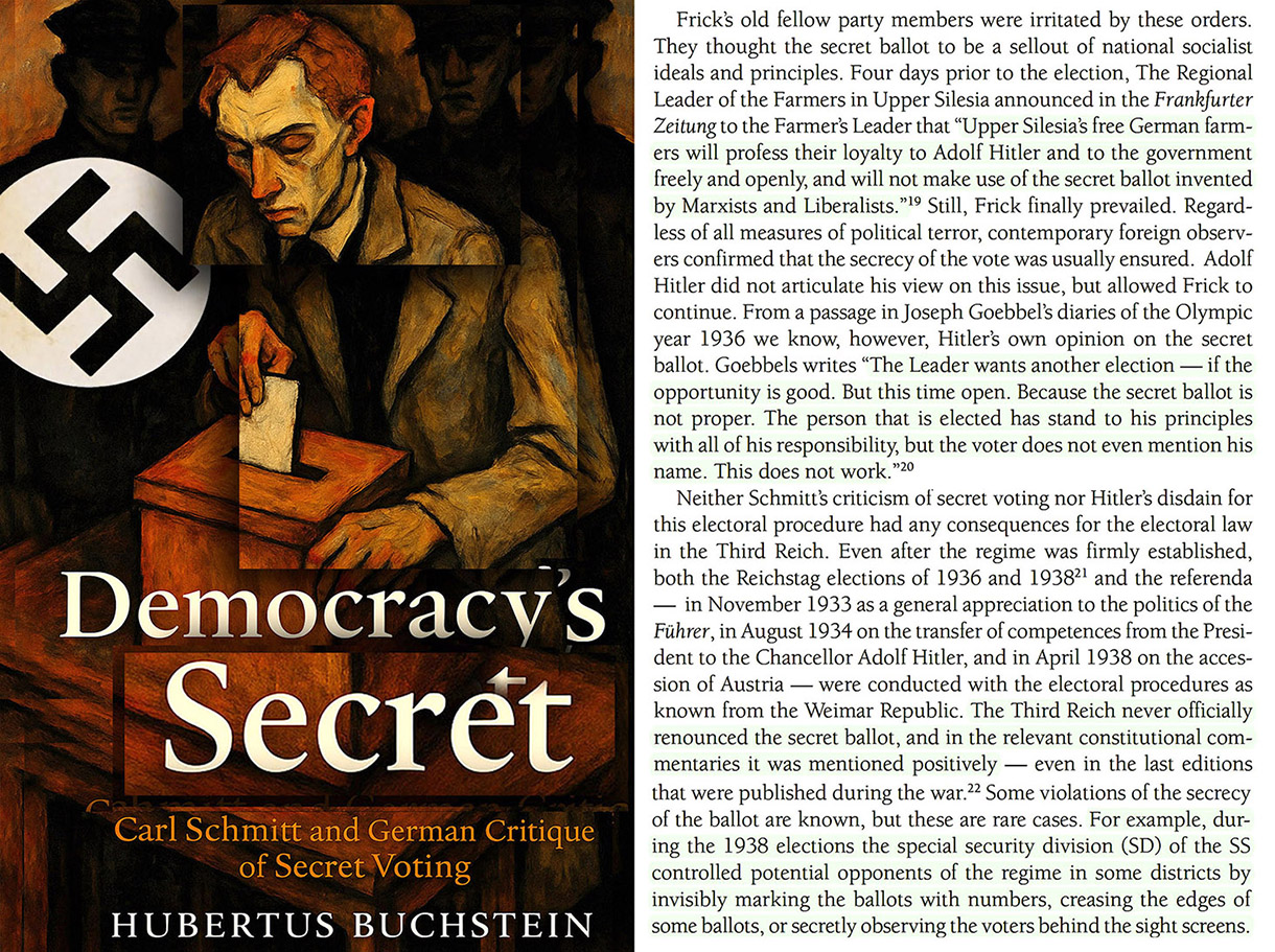 Frick’s old fellow party members were irritated by these orders. They thought the secret ballot to be a sellout of national socialist ideals and principles. Four days prior to the election, The Regional Leader of the Farmers in Upper Silesia announced in the Frankfurter Zeitung to the Farmer’s Leader that “Upper Silesia’s free German farmers will profess their loyalty to Adolf Hitler and to the government freely and openly, and will not make use of the secret ballot invented by Marxists and Liberalists.”19 Still, Frick finally prevailed. Regardless of all measures of political terror, contemporary foreign observers confirmed that the secrecy of the vote was usually ensured. Adolf Hitler did not articulate his view on this issue, but allowed Frick to continue. From a passage in Joseph Goebbel’s diaries of the Olympic year 1936 we know, however, Hitler’s own opinion on the secret ballot. Goebbels writes “The Leader wants another election — if the opportunity is good. But this time open. Because the secret ballot is not proper. The person that is elected has stand to his principles with all of his responsibility, but the voter does not even mention his name. This does not work.”20 Neither Schmitt’s criticism of secret voting nor Hitler’s disdain for this electoral procedure had any consequences for the electoral law in the Third Reich. Even after the regime was firmly established, both the Reichstag elections of 1936 and 193821 and the referenda — in November 1933 as a general appreciation to the politics of the Führer, in August 1934 on the transfer of competences from the President to the Chancellor Adolf Hitler, and in April 1938 on the accession of Austria — were conducted with the electoral procedures as known from the Weimar Republic. The Third Reich never officially renounced the secret ballot, and in the relevant constitutional commentaries it was mentioned positively — even in the last editions that were published during the war.22 Some violations of the secrecy of the ballot are known, but these are rare cases. For example, during the 1938 elections the special security division (SD) of the SS controlled potential opponents of the regime in some districts by invisibly marking the ballots with numbers, creasing the edges of some ballots, or secretly observing the voters behind the sight screens.