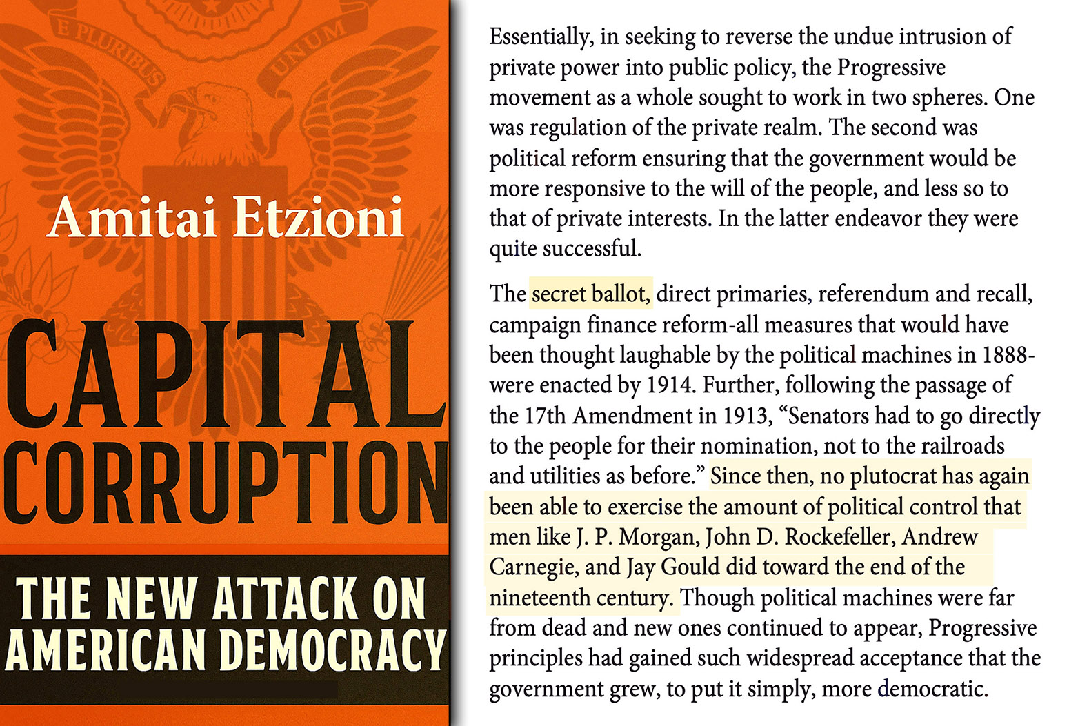 Essentially, in seeking to reverse the undue intrusion of private power into public policy, the Progressive movement as a whole sought to work in two spheres. One was regulation of the private realm. The second was political reform ensuring that the government would be more responsive to the will of the people, and less so to that of private interests. In the latter endeavor they were quite successful. The secret ballot, direct primaries, referendum and recall, campaign finance reform-all measures that would have been thought laughable by the political machines in 1888-were enacted by 1914. Further, following the passage of the 17th Amendment in 1913, “Senators had to go directly to the people for their nomination, not to the railroads and utilities as before.” Since then, no plutocrat has again been able to exercise the amount of political control that men like J. P. Morgan, John D. Rockefeller, Andrew Carnegie, and Jay Gould did toward the end of the nineteenth century. Though political machines were far from dead and new ones continued to appear, Progressive principles had gained such widespread acceptance that the government grew, to put it simply, more democratic.