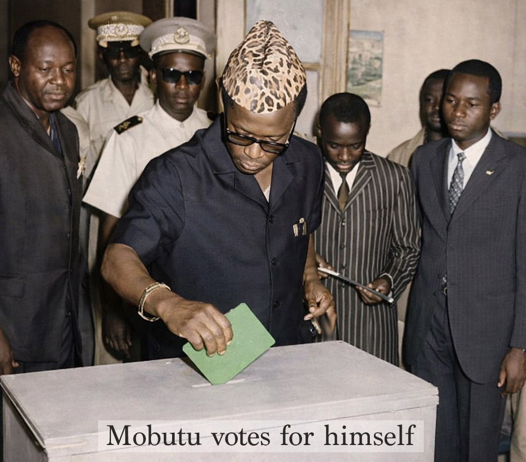 When casting his ballot, president, Mobutu Sese Sseko, votes in front of the cameras. He rips up a red ballot ‘le chaos’ and casts a green one ‘pour l’espoir’ - for himself. He was the only candidate from 1970 through 1980s and most open-ballot polling stations had no red cards. In the end, support for the red card fizzled. A visit to the polls showed one possible reason. One of the election officials, sat with a stack of green cards on his desk; there weren’t any red cards in sight. A soldier in green fatigues stood at the doorway. “We don’t need red cards here because nobody asks for one,” says Citizen Simba. “President Mobutu has decreed that Zairians must call one another citizen and use African names.” At a second polling place, again there are no red ballots. No demand, says Citizen Mbangala Mbe Lokoya, the local party official. “Everyone wants Mobutu.” The word went around Kinshasa that the bishop of Kisangani, a northern city, ripped up the green card sent to him and demanded a red one. Asked about the absence of red ballots, President Mobutu says some election officials hid red ballots because they felt that having them out in the open would be “a provocation.”