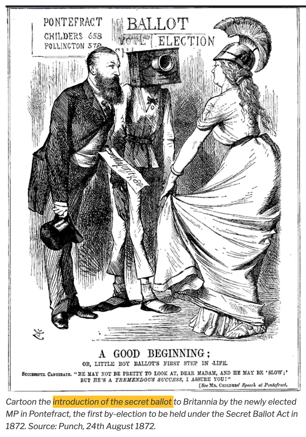 The Ballot Act of 1872 finally gave Britain the secret ballot, thereby striking a major blow against electoral corruption and intimidation and greatly diminishing the ability of the landowning elite to control electoral outcomes.Sheri Berman 2019